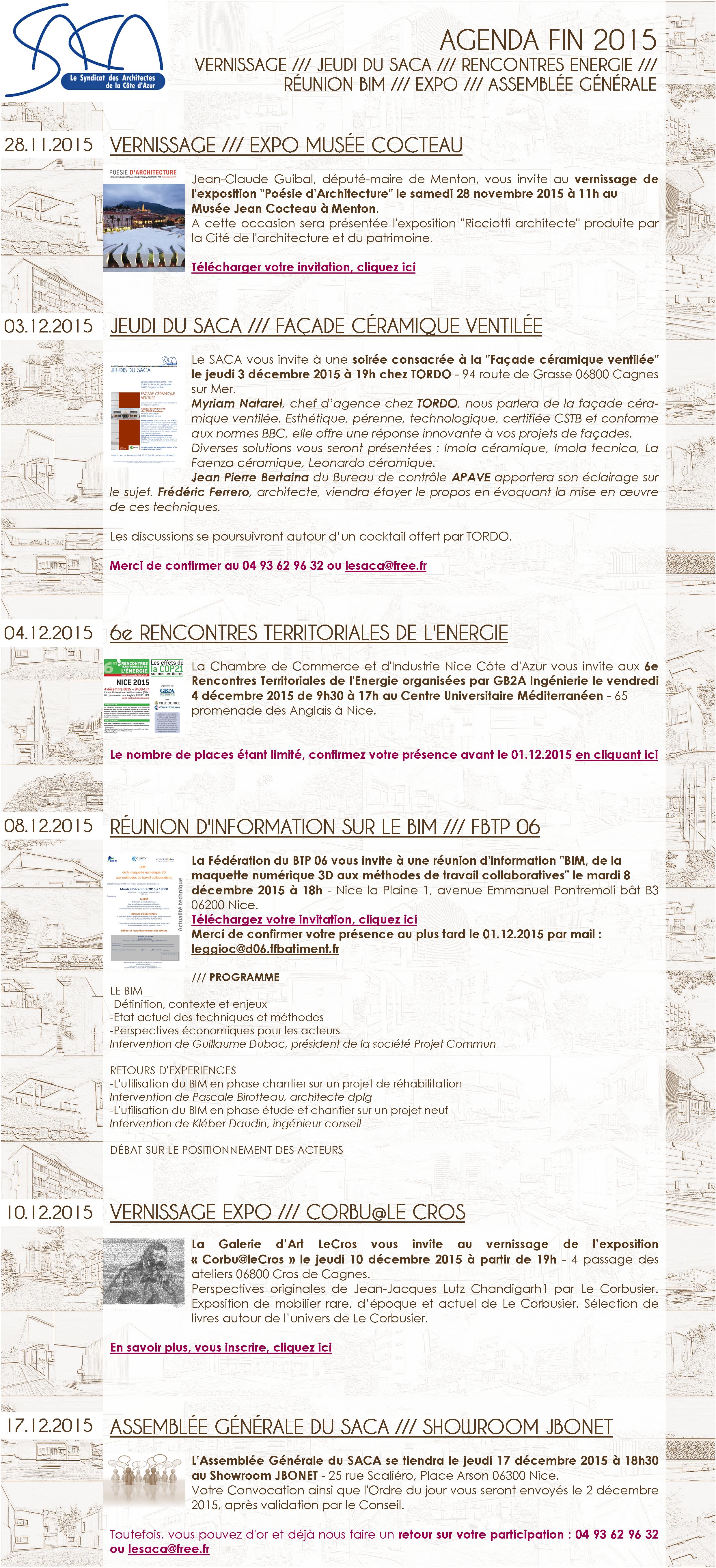 - 03.12.2015 : Jeudi du SACA consacré à la “Façade céramique ventilée”, 19h chez TORDO