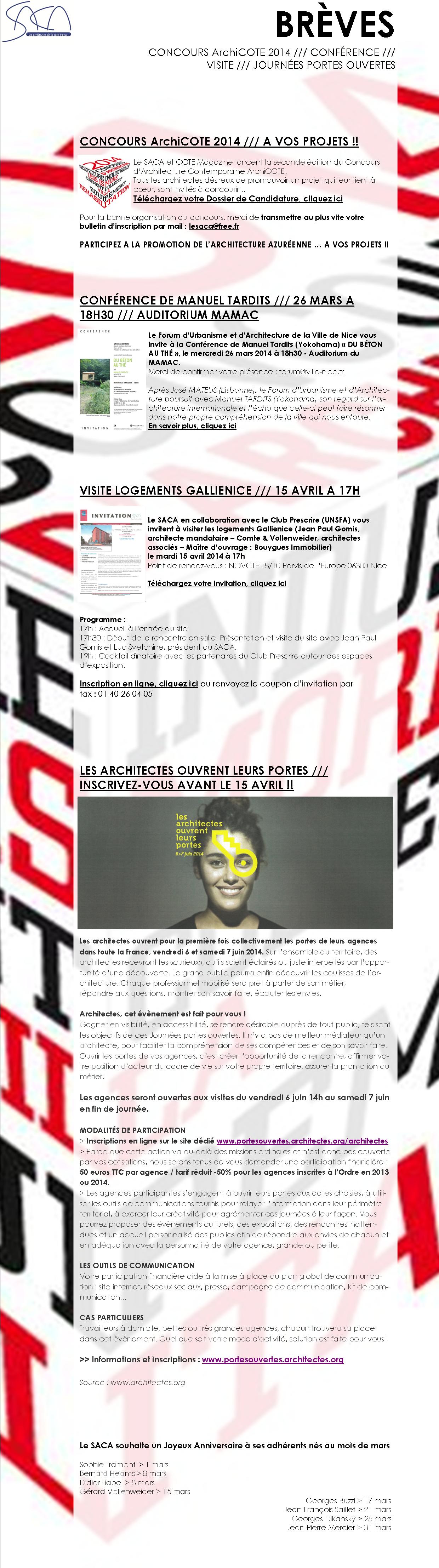 BRÈVES – CONCOURS ArchiCOTE /// CONFÉRENCE /// VISITE /// JOURNÉES PORTES OUVERTES Au sommaire: Concours ArchiCOTE 2014 – A vos projets !! Conférence de Manuel Tardits – 26 mars à 18h30 – MAMAC Visite des logements Gallienice – 15 avril à 17h Les Architectes ouvrent leurs portes – Inscrivez-vous avant le 15 avril !! Lire la brève du 17/03/2014