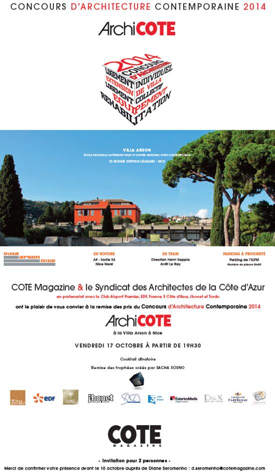 La soirée de Remise des prix du Concours d’Architecture Contemporaine ArchiCOTE 2014 se tiendra le vendredi 17 octobre 2014 à partir de 19h30 à la Villa Arson – 20 avenue Stephen Liégard 06000 Nice.