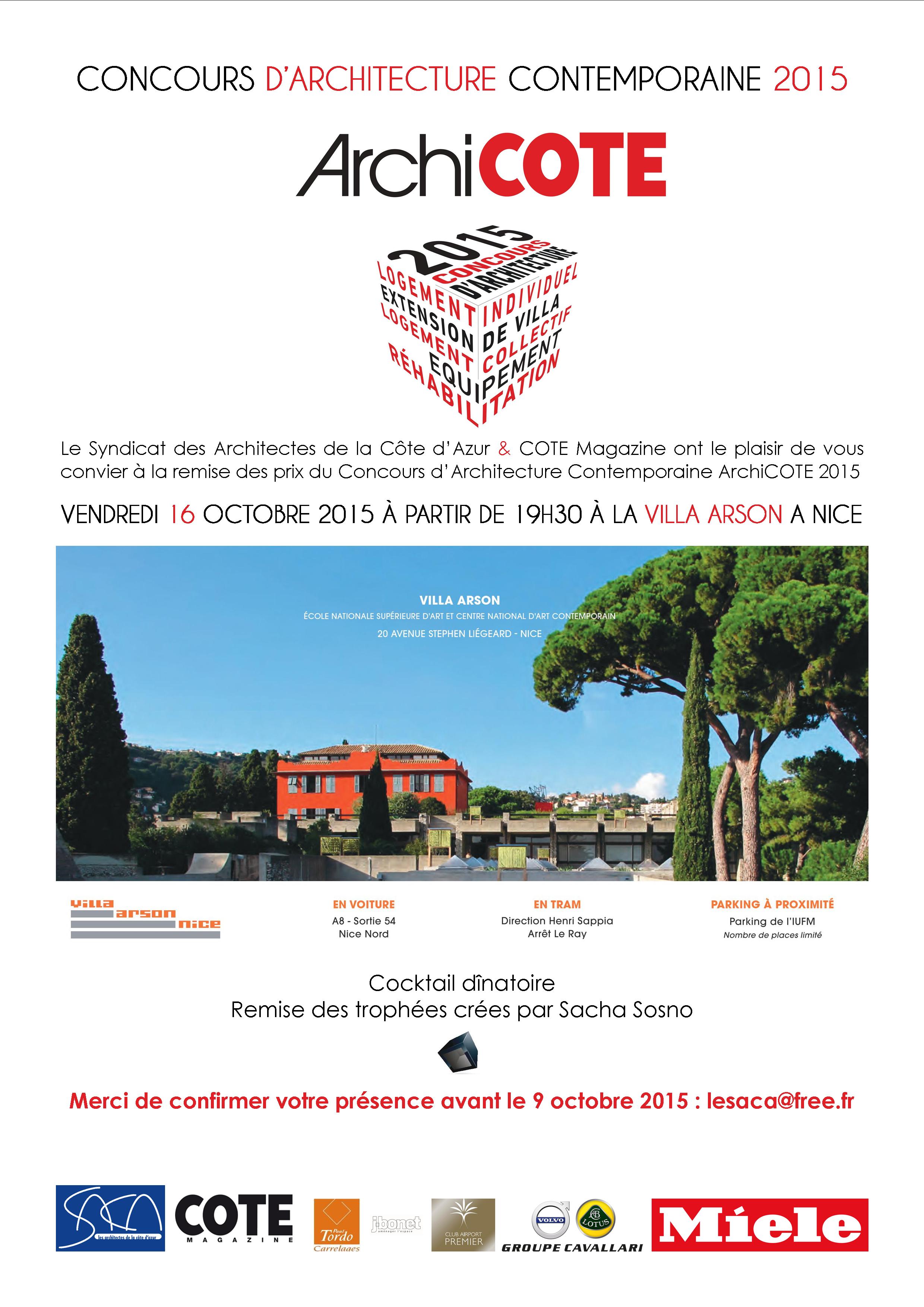La soirée de remise des prix du Concours d’Architecture Contemporaine ArchiCOTE 2015 se tiendra le vendredi 16 octobre 2015 à 19h30 à la Villa Arson – 20 avenue Stephen Liégard 06100 Nice.