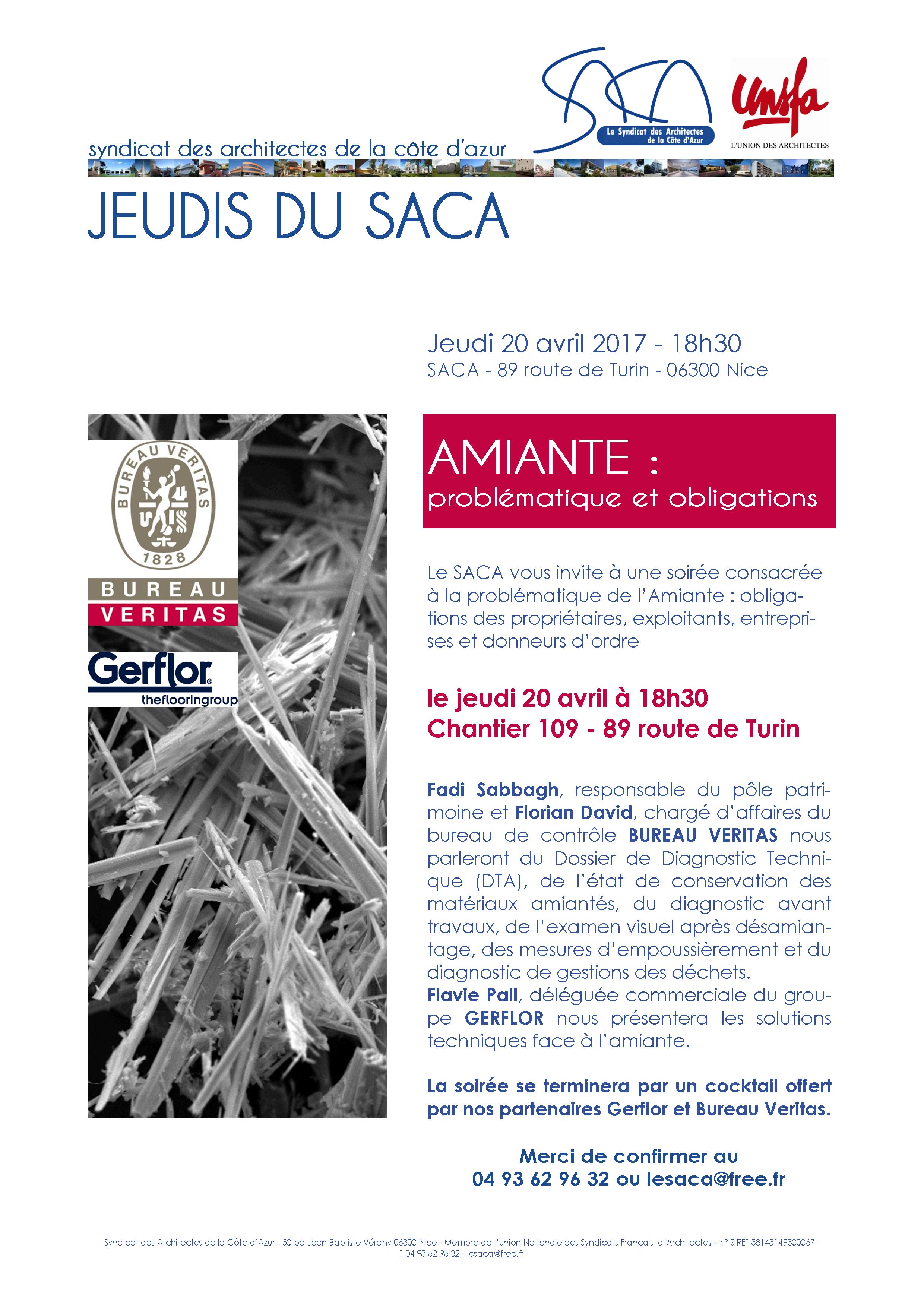 Le SACA vous invite à une soirée consacrée à la problématique de l’Amiante : obligations des propriétaires, exploitants, entreprises et donneurs d’ordre, le jeudi 20 avril à 18h30 – Chantier 109, 89 route de Turin 06300 Nice