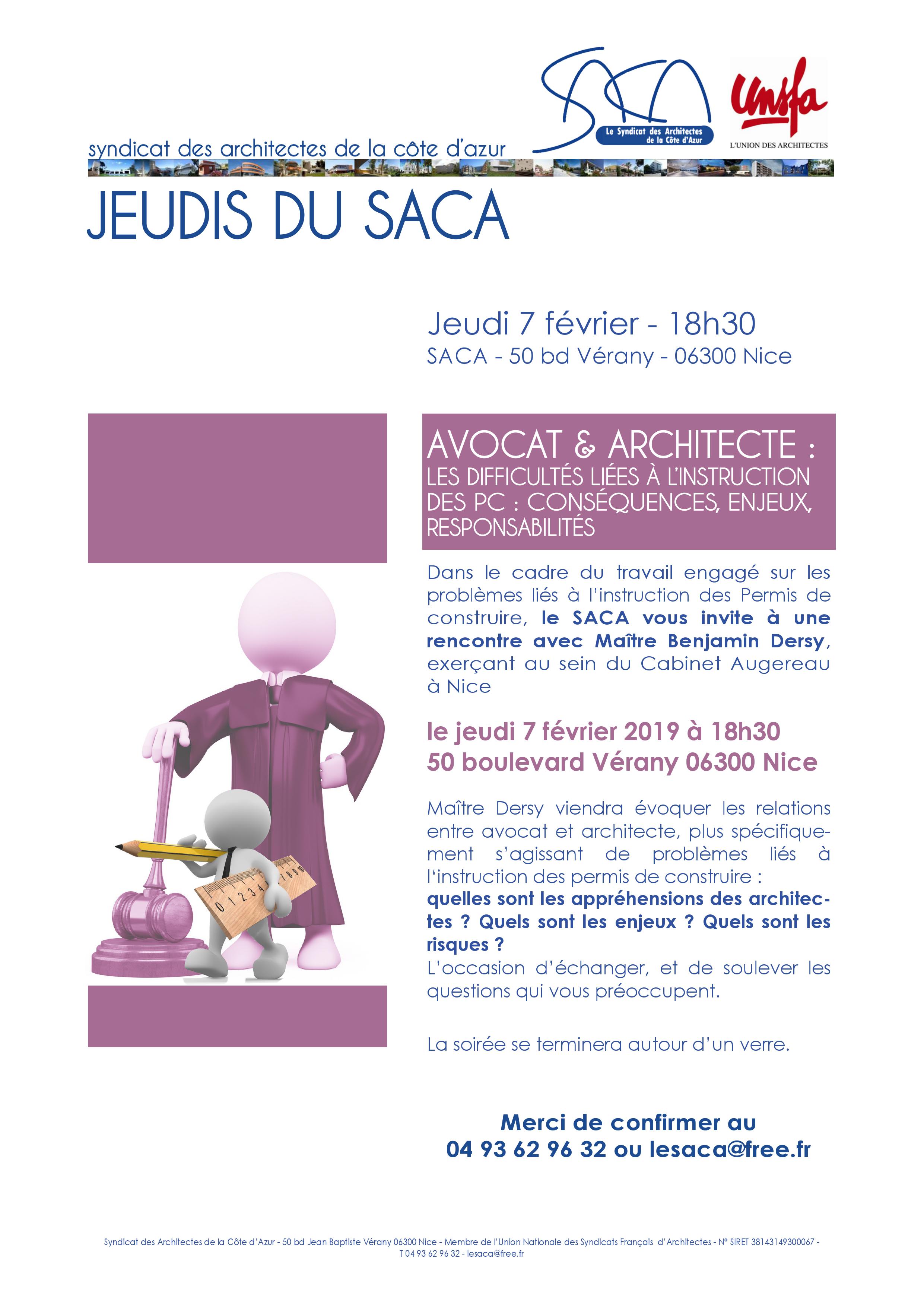 0001Dans le cadre du travail engagé sur les problèmes liés à l’instruction des Permis de construire, le SACA vous invite à une rencontre avec Maître Benjamin Dersy, exerçant au sein du Cabinet Augereau, le jeudi 7 février à 18h30 au 109 – 50 boulevard Vérany 06300 Nice.