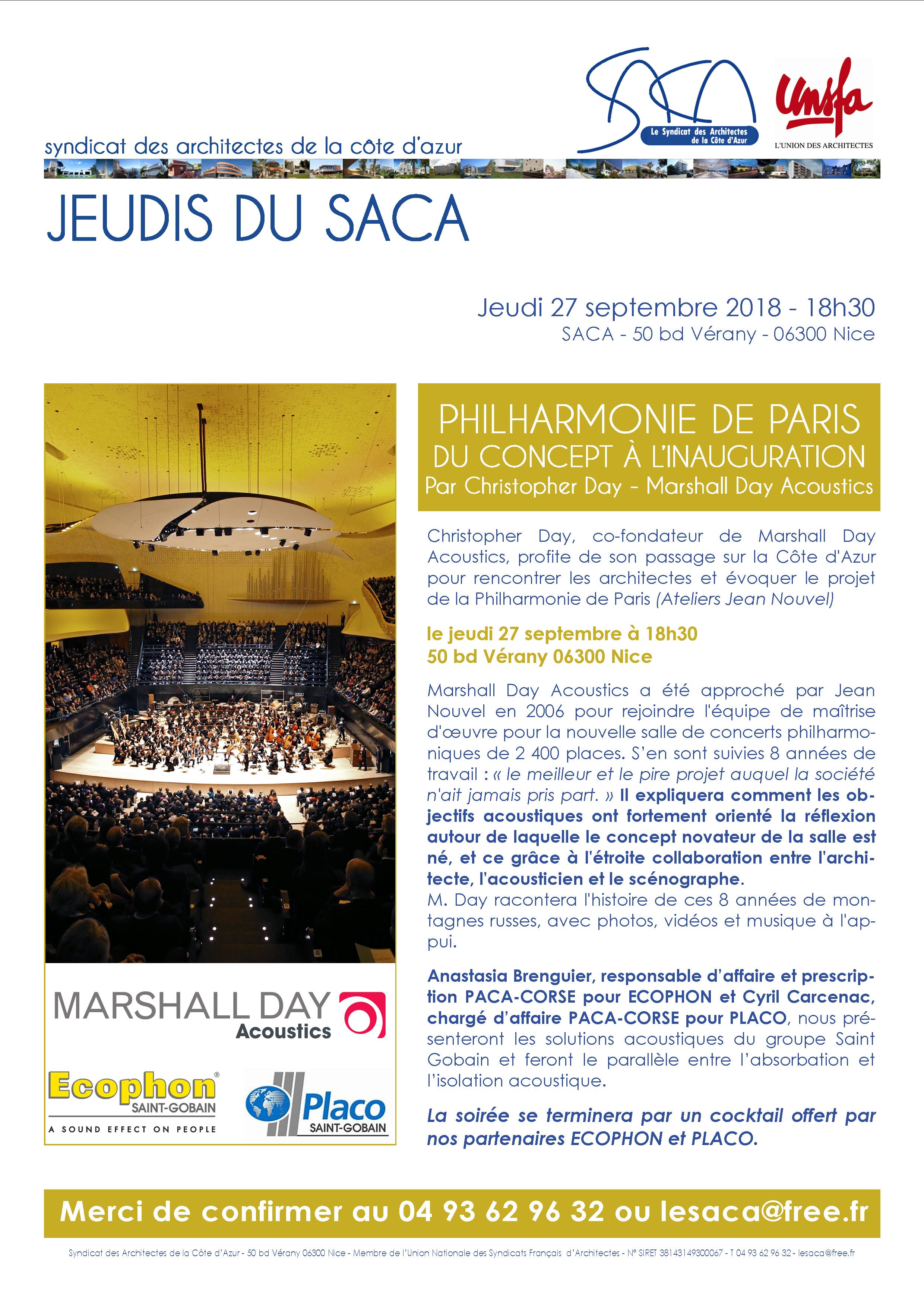PHILHARMONIE - 27.09.2018Christopher Day, co-fondateur de Marshall Day Acoustics, profite de son passage sur la Côte d’Azur pour rencontrer les architectes et évoquer le projet de la Philharmonie de Paris (Ateliers Jean Nouvel) le jeudi 27 septembre à 18h30 – 50 bd Vérany 06300 Nice.