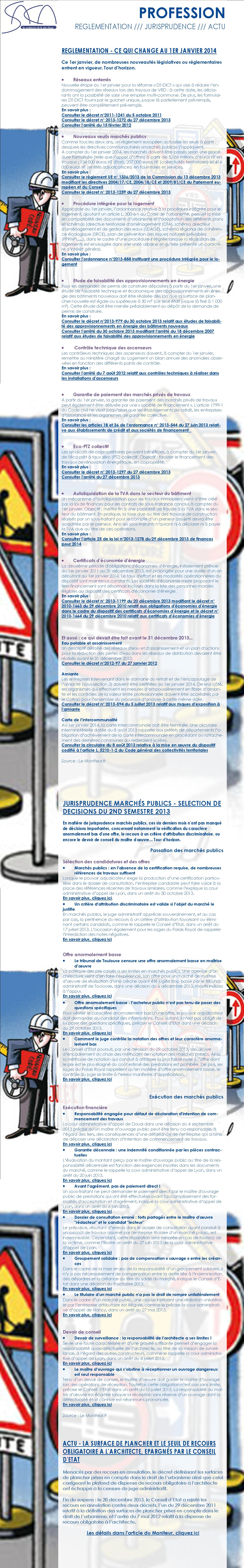 - Réglementation – Ce qui change au 1er janvier 2014 : tour d’horizon des nombreuses nouveautés législatives et réglementaires qui entrent en vigueur ce 1er janvier.