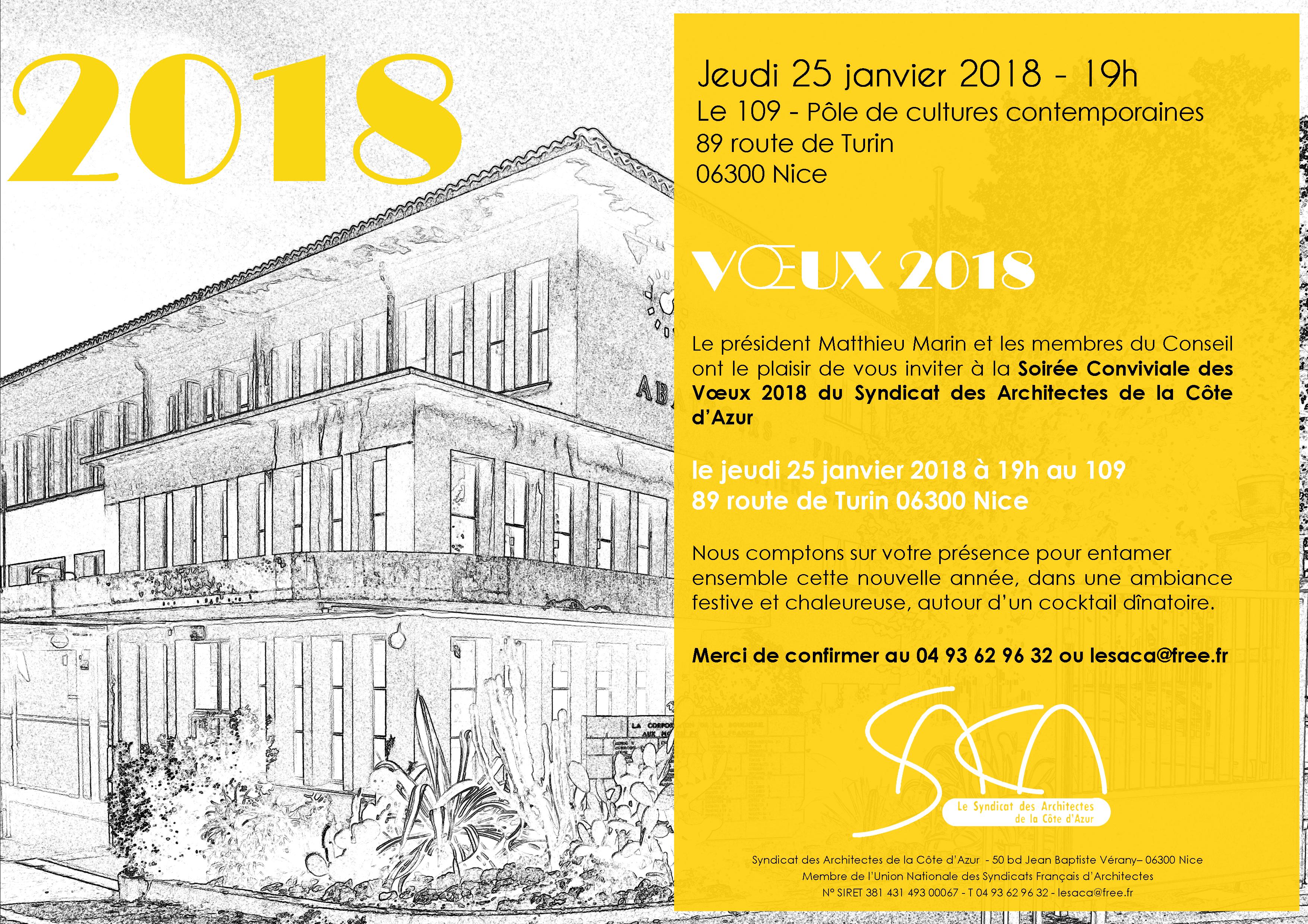 Le président Matthieu Marin et les membres du Conseil ont le plaisir de vous inviter à la Soirée Conviviale des Vœux 2018 du Syndicat des Architectes de la Côte d’Azur